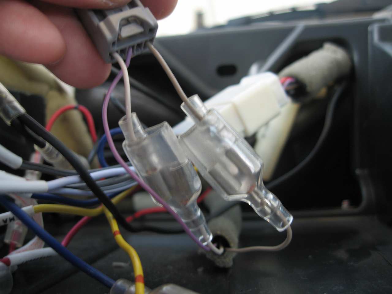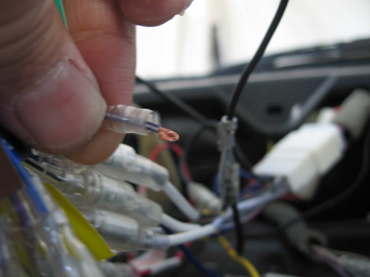 ↓ 外と、車内に通じる部分で、黄色の線を切って、二股化しました。
