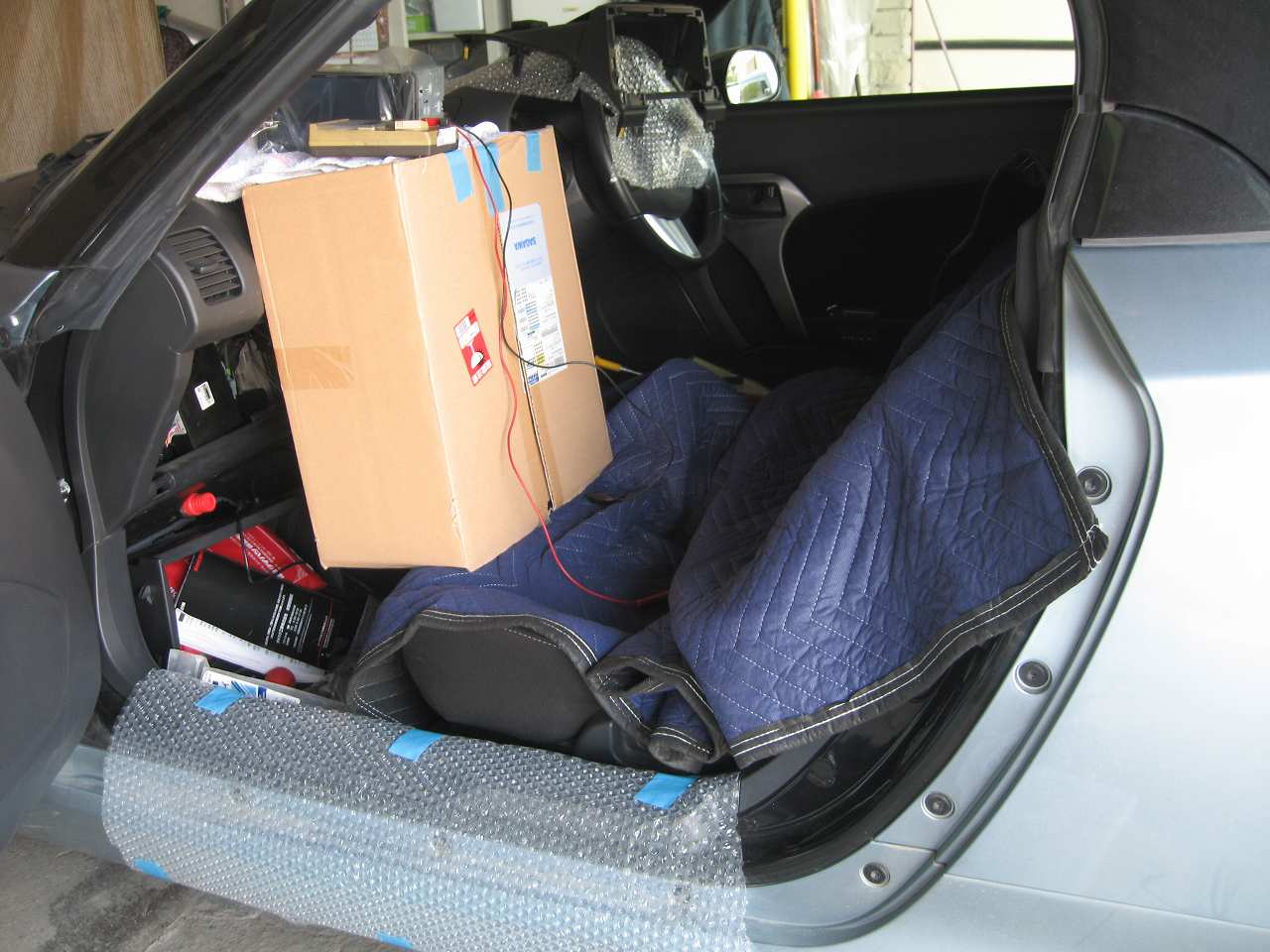 ↓ コンポの配線が短いので、ダンボールで作業台を作りました。